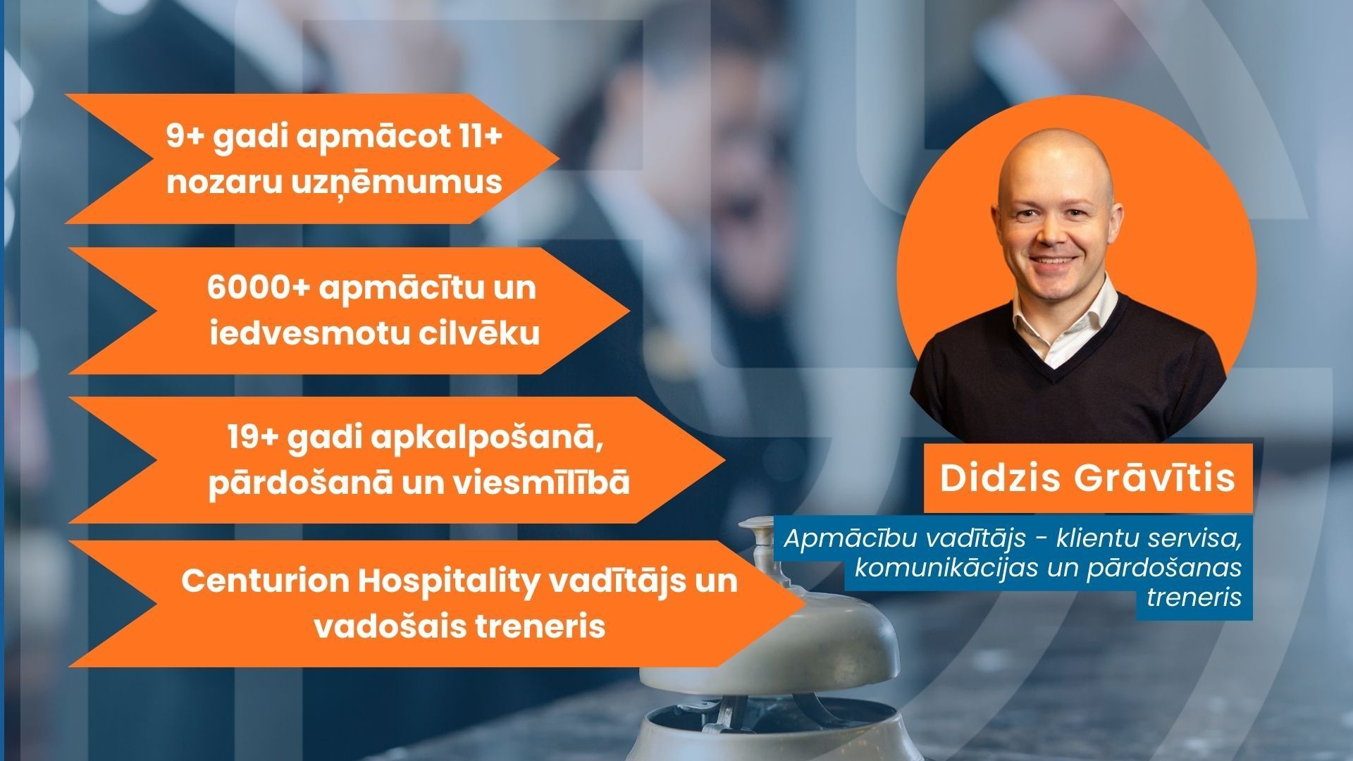 Pasniedzējs: Didzis Grāvītis – Centurion Hospitality vadītājs un vadošais treneris. Didzis ir viens no Latvijā vadošajiem komunikācijas ekspertiem ar plašu pieredzi pieczvaigžņu viesnīcās un sadarbību ar tādiem uzņēmumiem kā Italissimo, Mogotel, SemaraH, Tiamo Grupa, Vincents un daudziem citiem. Viņš ir atzīts par spēcīgu iedvesmotāju, kurš spēj vienlaikus uzrunāt vadību, darbiniekus un klientus, palīdzot radīt uzlabojumus uzņēmuma iekšējā kultūrā un apkalpošanas kvalitātē.