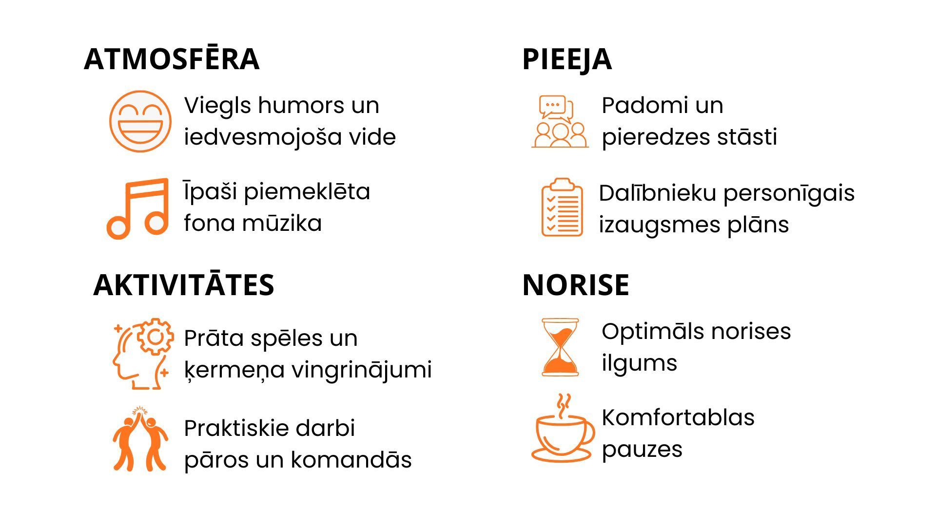 Mācības katrā dienā plānotas plkst. 10:00-15:00 un norisināsies Aston Hotel IV zālē Brīvības ielā 48/50, Rīgā. Lai saņemtu 100% atbalstu apmācību maksai, dalībniekiem jāapmeklē 75% jeb 4 apmācību dienas.
