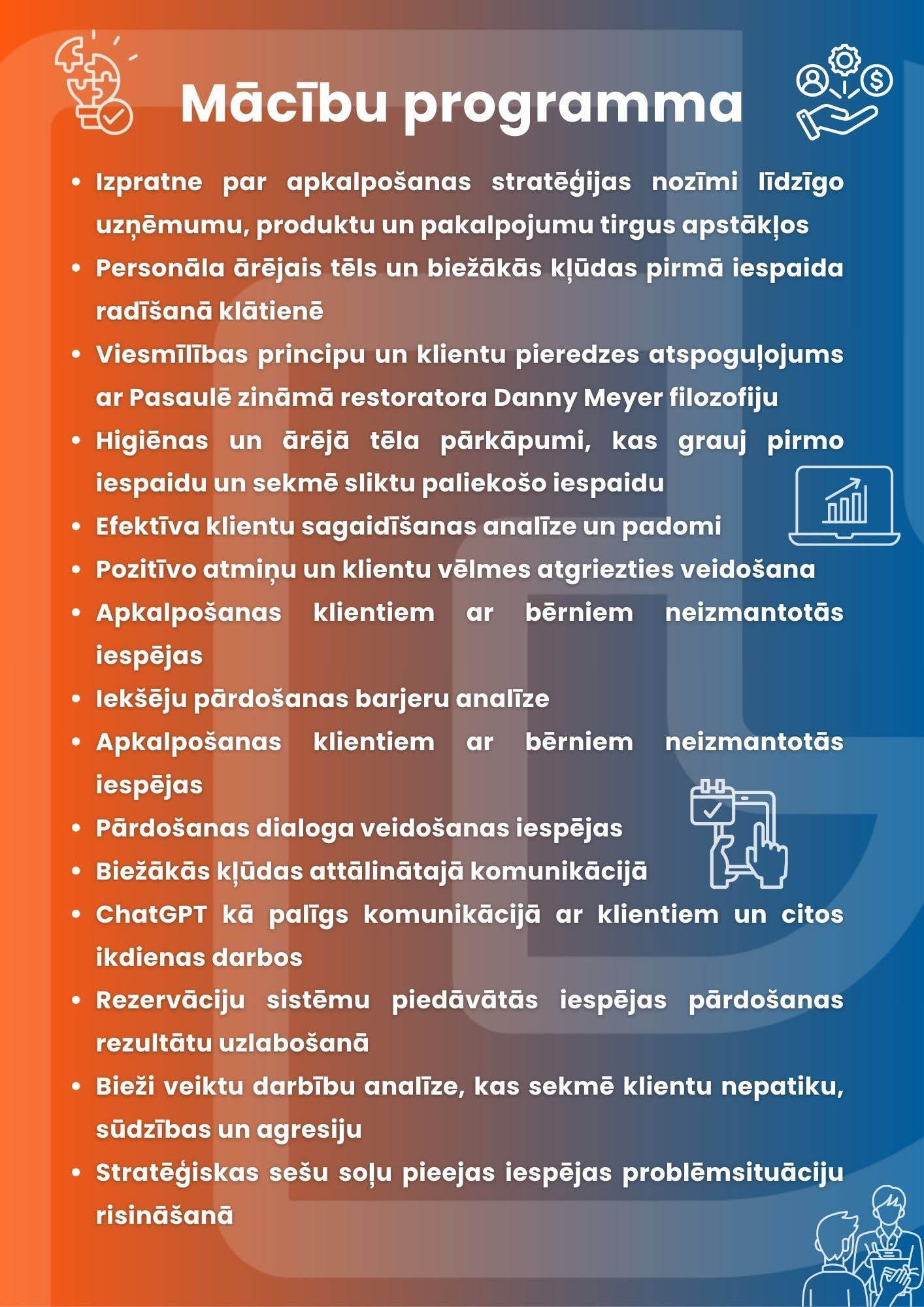 Piecu dienu laikā dalībnieki iegūs praktiskas zināšanas un iedvesmu, lai paaugstinātu pakalpojumu kvalitāti un efektīvāk izmantotu digitālos risinājumus savā ikdienas darbā. Mācības tiek piedāvātas ar 100% Eiropas Savienības līdzfinansējumu apmācību maksai*.