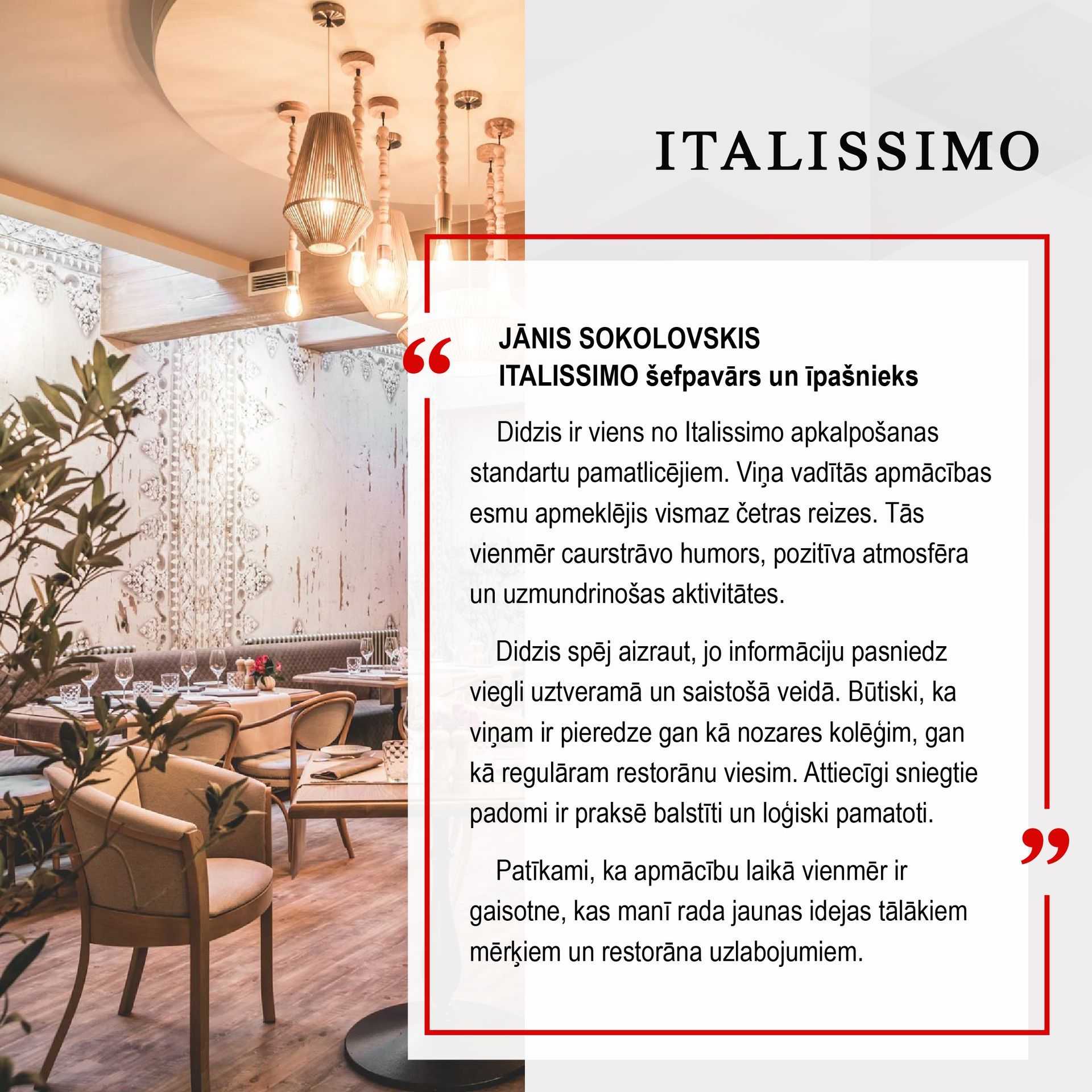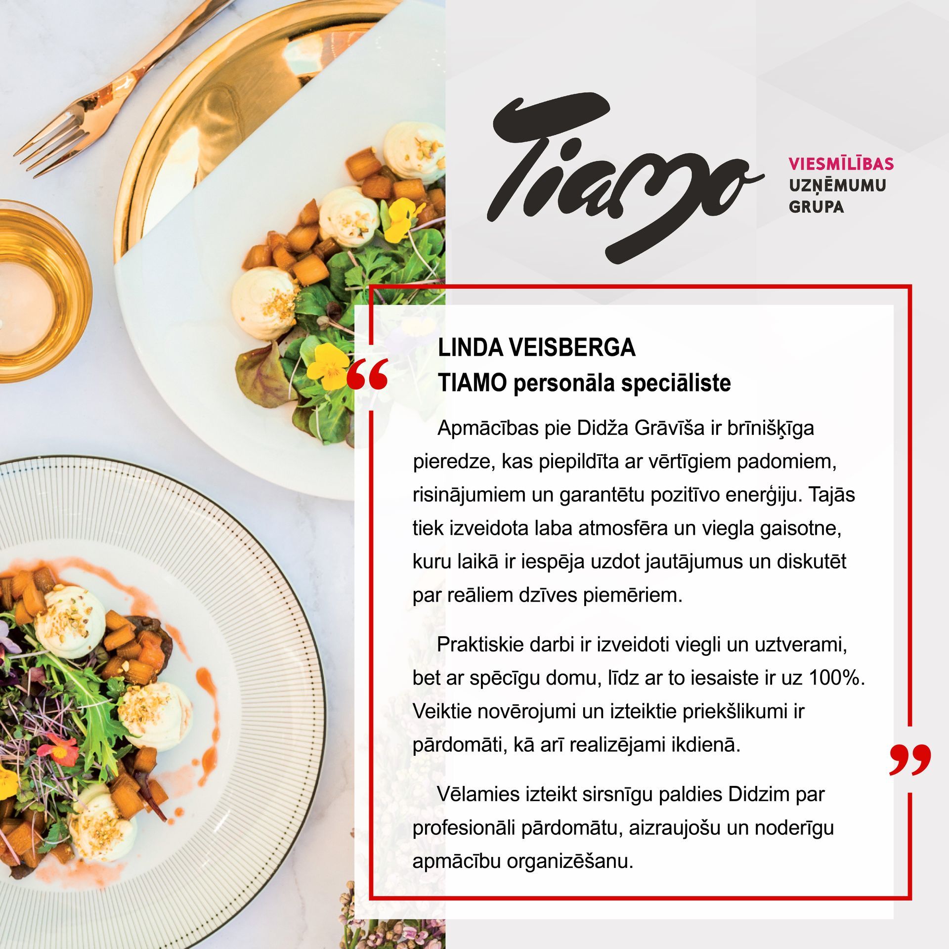 Pasniedzējs: Didzis Grāvītis – Centurion Hospitality vadītājs un vadošais treneris. Didzis ir viens no Latvijā vadošajiem komunikācijas ekspertiem ar plašu pieredzi pieczvaigžņu viesnīcās un sadarbību ar tādiem uzņēmumiem kā Italissimo, Mogotel, SemaraH, Tiamo Grupa, Vincents un daudziem citiem. Viņš ir atzīts par spēcīgu iedvesmotāju, kurš spēj vienlaikus uzrunāt vadību, darbiniekus un klientus, palīdzot radīt uzlabojumus uzņēmuma iekšējā kultūrā un apkalpošanas kvalitātē.