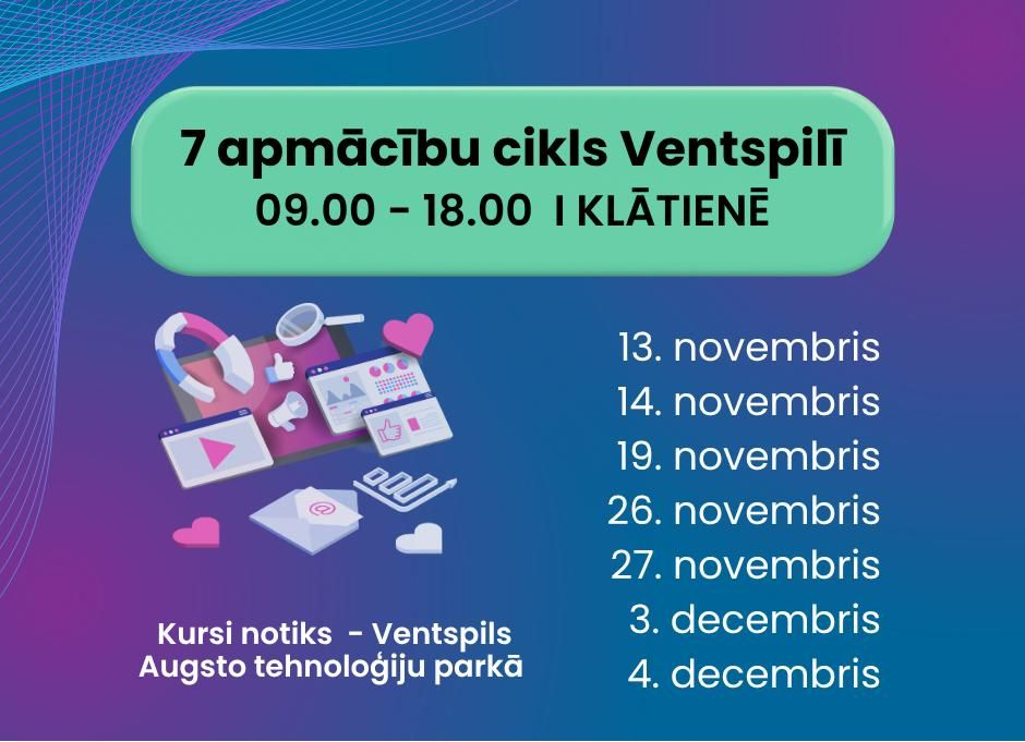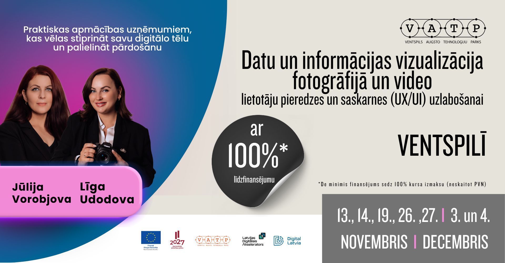 Ventspils Augsto tehnoloģiju parks kā Latvijas Digitālā akseleratora Ziemeļkurzemes kontaktpunkts aicina uzņēmumus izmantot iespēju un pieteikties mācībām "Datu un informācijas vizualizācija fotogrāfijā un video lietotāju pieredzes un saskarnes (UX/UI) uzlabošanai".