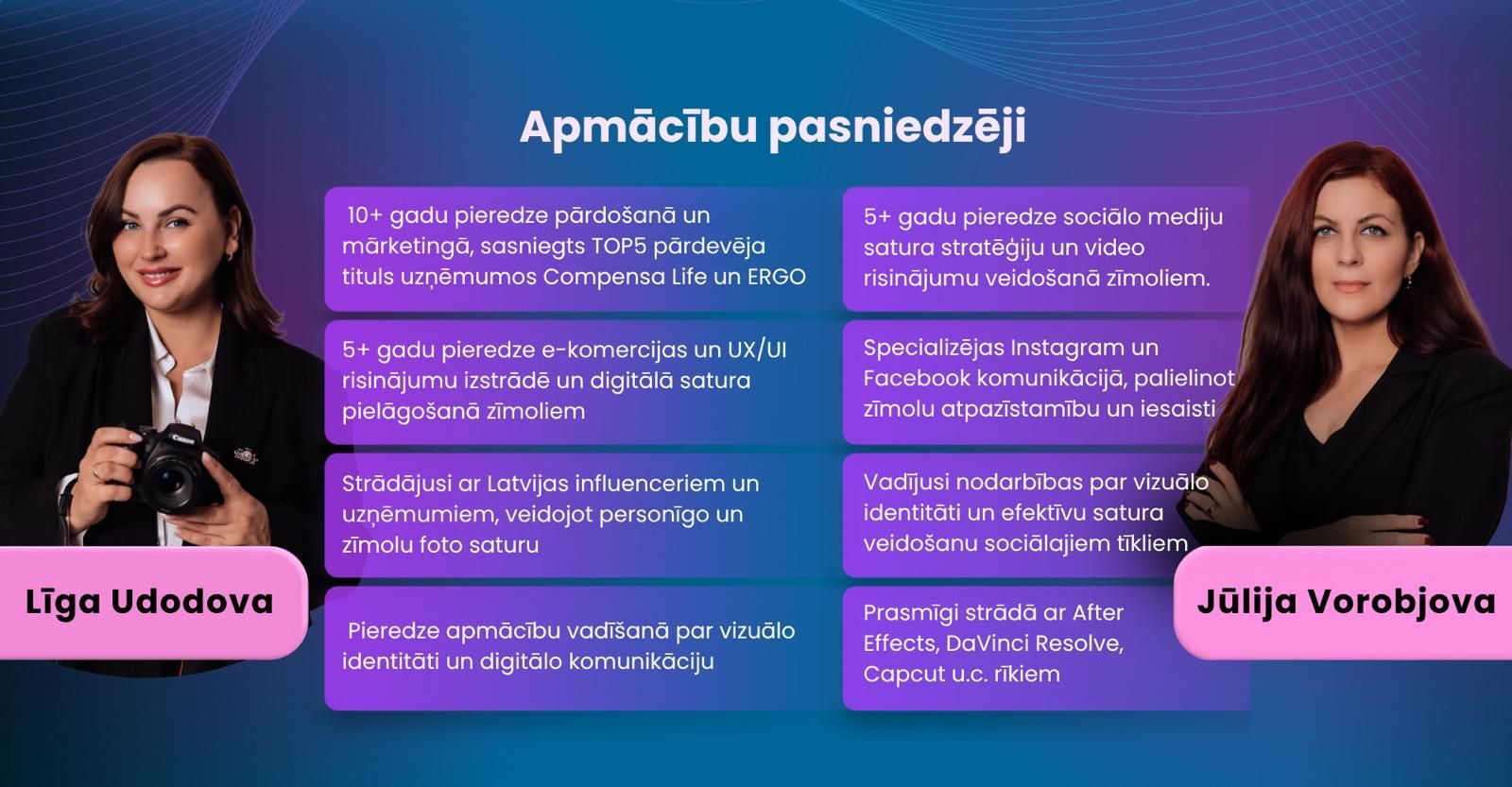 Lektore Līga Udodova ir profesionāla fotogrāfe un digitālā satura veidotāja ar vairāk nekā 10 gadu pieredzi mārketingā un pārdošanā, specializējoties personīgā un uzņēmumu zīmola fotogrāfijās, e-komercijas vizuālā satura izstrādē un UX/UI optimizācijā. Savukārt Jūlija Vorobjova ir profesionāla videogrāfe un digitālā satura speciāliste ar vairāk nekā 5 gadu pieredzi sociālo mediju mārketingā, zīmolu komunikācijā un vizuālās identitātes veidošanā.