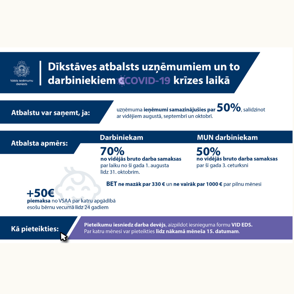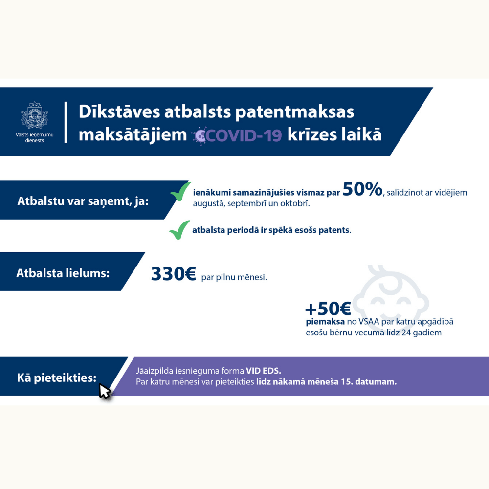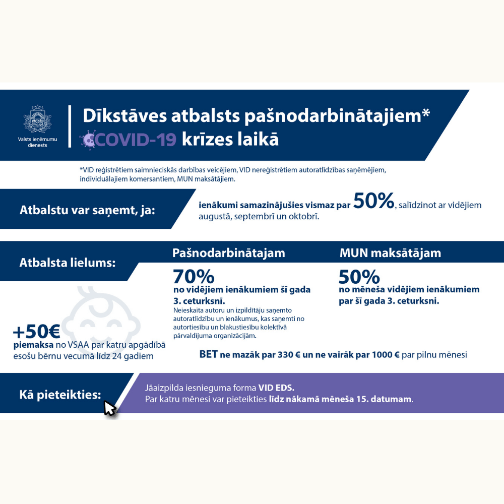 Lai palīdzētu tautsaimniecībā aktīvajiem iedzīvotājiem Covid-19 dēļ noteikto ierobežojumu laikā, Ministru kabinets ir pieņēmis noteikumus, paredzot atbalsta pasākumus darbinieku atlīdzību, kā arī pašnodarbināto un patentmaksātāju ienākumu kompensēšanai. Atbalsta izmaksu nodrošinās Valsts ieņēmumu dienests (VID) un pieteikumus Elektroniskās deklarēšanas sistēmā (EDS) varēs iesniegt, sākot no 1. decembra.