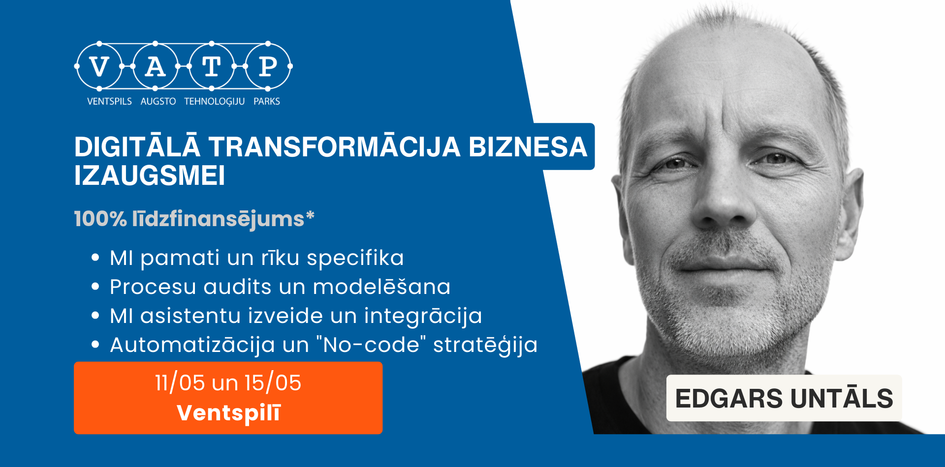 Datums: 11. un 15. Maijs 2026 Laiks: no plkst. 10:00-16:00 (ar 1h pusdienu pārtraukumu) Norises vieta: Ventspils Augsto Tehnoloģiju parks 1 (A1 ieeja 2. stāvs) Kursa cena (bez PVN): 1264.00 € * Atmaksājamā PVN daļa : 265.00 € * Lai saņemtu atbalstu ar 100% DE MINIMIS līdzfinansējumu ir nepieciešams iesniegt 4 dokumentus: Digitālā Brieduma testu ( https://tests.edic.lv ) Digitālo prasmju Ceļa karti (turpat https://tests.edic.lv , kad tests ir izpildīts) De minimis veidlapa ( https://eds.vid.gov.lv ) Atbalsta pieteikuma veidlapa (elektroniski parakstīta) V isu sagatavoto dokumentāciju nepieciešams nosūtīt jūsu konsultantam: simona.graudina@vatp.lv ; Telefons: 29110939 Kursa apraksts MI valodas modeļu un instrumentu specifika un to praktisks pielietojums biznesa izaugsmei; Svarīgāko biznesa procesu modelēšana un pielāgošana izvēlētajam biznesa modelim; Efektīvākās metodes un MI instrumenti biznesa procesu auditam, "vājo posmu" identificēšanai un prioritizēšanai pirms digitalizācijas uzsākšanas; Specifiku MI Asistentu izveide un integrācija; Promptu un instrukciju izveides pamatprincipi; Digitālo rīku ieviešanas stratēģija: "Low-code" un "No-code" risinājumu integrācija; Automatizācija kā konkurētspējas priekšrocība: praktiski piemēri darba plūsmu automatizēšanai. Kursa mērķis Palīdzēt dalībniekiem apgūt progresīvākos digitālās transformācijas instrumentus un radīt izpratni par MI iespējām biznesa mērķu sasniegšanā K omersantu ieguvums pēc kursa pabeigšanas Dalībnieki apgūst progresīvākos digitālās transformācijas instrumentus. Veic savas biznesa idejas vai esošās sistēmas auditu. Māk rakstīt ietekmīgas komandas jeb promptus. Automatizē svarīgākos ikdienas darba procesus. Apgūst MI sniegtās priekšrocības. Izveido savu personīgo MI Asistentu un iemācās to iesaistīt svarīgāko biznesa procesu veikšanai. P riekšzināšanas Nav nepieciešamas Pasniedzējs - Edgars Untāls Uzņēmuma CCGROUP vadītājs. 3 grāmatu autors. Sertificēts Biznesa Koučs, NLP treneris un MI Arhitekts. Strādājis par pārdošanas aģentu un vadītāju Šveices farmācijas uzņēmumā. Veicis vairāk nekā 15 000 darījumu tikšanos. Apmācījis un konsultējis tādus uzņēmumus kā Toyota, Mercedes, Samsung, IKEA, Coca-Cola un citus. Pasākums notiek projekta “EDIC uzņēmumu digitālo prasmju attīstība” Projekta nr. 2.3.1.2.i.0/1/24/I/CFLA/001 ietvaros.