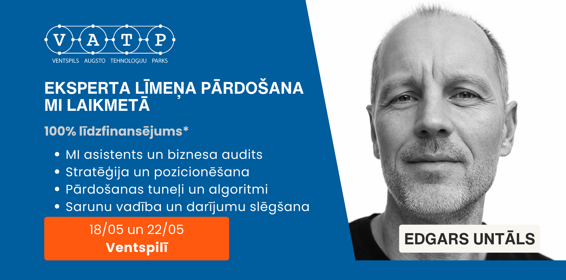 Datums: 18. un 22. Maijs 2026 Laiks: no plkst. 10:00-16:00 (ar 1h pusdienu pārtraukumu) Norises vieta: Ventspils Augsto Tehnoloģiju parks 1 (A1 ieeja 2. stāvs) Kursa cena (bez PVN): 1264.00 € * Atmaksājamā PVN daļa : 265.00 € * Lai saņemtu atbalstu ar 100% DE MINIMIS līdzfinansējumu ir nepieciešams iesniegt 4 dokumentus: Digitālā Brieduma testu ( https://tests.edic.lv ) Digitālo prasmju Ceļa karti (turpat https://tests.edic.lv , kad tests ir izpildīts) De minimis veidlapa ( https://eds.vid.gov.lv ) Atbalsta pieteikuma veidlapa (elektroniski parakstīta) V isu sagatavoto dokumentāciju nepieciešams nosūtīt jūsu konsultantam: simona.graudina@vatp.lv ; Telefons: 29110939 Kursa apraksts I ndividuāla MI Asistenta izveide - Asistents aktīvi piedalīsies gan apmācību procesā, gan pārējos kursa posmos; Sagatavošanās un esošā biznesa modeļa audits - darbu veic īpaši šim mērķim izveidots MI Asistents; Mērķa auditorijas definēšana un klienta psiholoģiskā portreta izveide; Pārdošanas psiholoģijas algoritmi un formulas; Produkta/pakalpojuma pozicionēšana; Efektīva pārdošanas tuneļa izveide; Rezultatīva pārdošanas komunikācija telefoniski, e-pastā un klātienē; Ietekmīgākās pretestības pārvarēšanas un pārrunu vešanas tehnikas; Ietekmīgākās vienošanās un darījuma noslēgšanas tehnikas; Pēcpārdošana un attiecību veidošana. K ursa mērķis Izveidot dalībniekiem uz rezultātu orientētu domāšanas modeli un iemācīt jaudīgākos pārdošanas instrumentus un stratēģijas. K omersantu ieguvums pēc kursa pabeigšanas Dalībnieki apgūst efektīvākās panākumu domāšanas formulas, izveido uz rezultātu vērstus ieradumus, izprot pārdošanas sistēmu kopumā un atsevišķus tās elementus. Apgūst MI sniegtās priekšrocības, izveido savu personīgo MI Asistentu un iemācās to iesaistīt svarīgāko biznesa procesu veikšanai – pārdošanas tuneļa izveidei, klientu profilēšanai, produktu pozicionēšanai, darījumu noslēgšanai. P riekšzināšanas Nav nepieciešamas Pasniedzējs - Edgars Untāls Uzņēmuma CCGROUP vadītājs. 3 grāmatu autors. Sertificēts Biznesa Koučs, NLP treneris un MI Arhitekts. Strādājis par pārdošanas aģentu un vadītāju Šveices farmācijas uzņēmumā. Veicis vairāk nekā 15 000 darījumu tikšanos. Apmācījis un konsultējis tādus uzņēmumus kā Toyota, Mercedes, Samsung, IKEA, Coca-Cola un citus. Pasākums notiek projekta “EDIC uzņēmumu digitālo prasmju attīstība” Projekta nr. 2.3.1.2.i.0/1/24/I/CFLA/001 ietvaros.