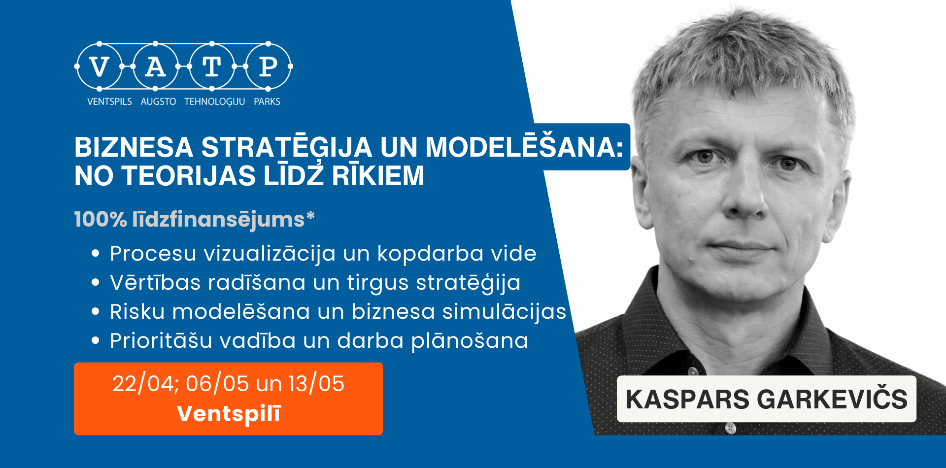 Datums: 22/04; 6/05 un 13/05 2026 Laiks: no plkst.13:00-17:00 (1.un 2. nodarbība) 09:00-13:00 (3. nodarbība) Norises vieta: Ventspils Augsto Tehnoloģiju parks 1 (A1 ieeja 2. stāvs) Kursa cena (bez PVN): 1265.00 € * Atmaksājamā PVN daļa : 266.00 € * L ai saņemtu atbalstu ar 100% līdzfinansējumu ir nepieciešams iesniegt 4 dokumentus: Digitālā Brieduma testu ( https://tests.edic.lv ) Digitālo prasmju Ceļa karti (turpat https://tests.edic.lv , kad tests ir izpildīts) De minimis veidlapa ( https://eds.vid.gov.lv ) Atbalsta pieteikuma veidlapa (elektroniski parakstīta) V isu sagatavoto dokumentāciju nepieciešams nosūtīt jūsu konsultantam: simona.graudina@vatp.lv ; Telefons: 29110939 Kursa apraksts Uzņēmuma darbības strukturēšana un biznesa procesu vizualizācija; Vērtības piedāvājuma izstrāde savam biznesa klientam; Zilā Okeāna stratēģijas un to rīku pielietošana jaunu tirgus iespēju noteikšanai; Kvalitātes Mājas metode un to rīki produkta vai pakalpojuma uzlabošanai; Panākumu varbūtības un biznesa riska ātras novērtēšanas metodes un rīki; Riska un nenoteiktības modelēšana ar biznesa simulācijas spēlēm; Prioritāšu vadība - efektīva darba veikšana digitālajos rīkos (Google sheets, Miro). Kursa mērķis Attīstīt uzņēmēju spēju strukturēti analizēt un vadīt savu biznesu, izmantojot stratēģijas un produktu attīstības metodes. Apgūt praktiskas pieejas, kas palīdz identificēt uzņēmuma attīstības šķēršļus, noteikt prioritātes un pieņemt pamatotus biznesa lēmumus nenoteiktības apstākļos. Iemācīties formulēt skaidru un konkurētspējīgu vērtības piedāvājumu saviem klientiem, izmantojot pārbaudītas stratēģijas metodes. Attīstīt prasmes strukturēt uzņēmuma darbību un vizualizēt biznesa procesus, izmantojot digitālos rīkus. Iepazīt pieejas, kas palīdz ātri novērtēt biznesa ideju, produktu vai stratēģisku lēmumu panākumu varbūtību un risku. K omersantu ieguvums pēc kursa pabeigšanas Skaidrāka izpratne par sava uzņēmuma darbības struktūru un attīstības iespējām; Prasme identificēt biznesa vājās vietas un kritiskos faktorus, kas ietekmē uzņēmuma izaugsmi; Izstrādāts un precizēts sava uzņēmuma vērtības piedāvājums klientiem; Iemaņas pielietot Zilā Okeāna stratēģijas un Kvalitātes Mājas metodes produktu vai pakalpojumu uzlabošanai; Praktisks ieskats biznesa risku un nenoteiktības modelēšanā, izmantojot biznesa simulācijas; Spēja apstrādāt informāciju, izmantojot digitālos rīkus un vizuālas metodes. P riekšzināšanas Vismaz 2 gadu pieredze uzņēmējdarbībā vai aktīva iesaiste uzņēmuma vadībā Pasniedzējs - Kaspars Garkevičs Uzņēmējs. Mentors Jaunuzņēmumu vadības programmā Ventspils Augstskolā. Pieredze ekomercijā, elektronikā, būvniecībā, jaunu produktus izstrādē un ieviešanā sērijveida ražošanā. Konsultējis > 60 jaunuzņēmumu dibinātājus investīciju piesaistei. Pasākums notiek projekta “EDIC uzņēmumu digitālo prasmju attīstība” Projekta nr. 2.3.1.2.i.0/1/24/I/CFLA/001 ietvaros.