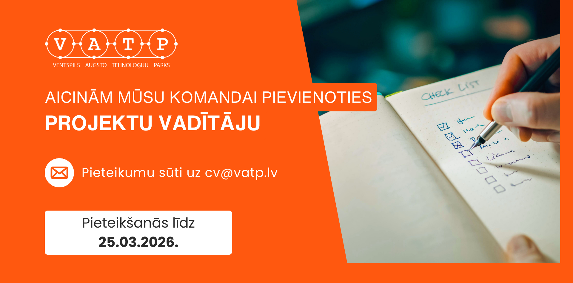 Nodibinājums "Ventspils Augsto tehnoloģiju parks" (VATP), reģ. Nr. 40008088258, aicina komandai pievienoties projektu vadītāju. Tavos galvenajos uzdevumos ietilps: Projektu pieteikumu, stratēģiju un plānu izstrāde un realizēšana. Projektu sadarbības partneru piesaiste. Esošo projektu īstenošana. Finanšu un saturisko atskaišu sagatavošana. Dažādu atbalsta pasākumu plānošana un organizēšana. Lieliski, ja Tev ir: Lieliskas komunikācijas un sadarbības prasmes. Mērķtiecīga, elastīga, uz rezultātiem vērsta personība. Pieredze projektu sagatavošanā un vadībā. Labas digitālās prasmes. Ļoti labas latviešu un labas angļu valodas zināšanas. Stratēģiskā un analītiskā domāšana, pašiniciatīva. Plānošanas un organizēšanas prasmes. Mēs piedāvājam: Interesantu un dinamisku pilnas slodzes darbu. Atalgojumu 1400-2000 EUR apmērā pirms nodokļu nomaksas (atkarībā no pieredzes un kompetences). Veselības apdrošināšanu (pēc pārbaudes laika). Mūsdienīgu darba vidi un aprīkojumu. Apmaksātas telefonsarunas un mobilo internetu. Profesionālās izaugsmes un apmācību iespējas. Draudzīgu un atsaucīgu komandu. Iespēju doties komandējumos uz interesantiem gala mērķiem. Ja šis piedāvājums raksturo tieši Tevi, ar prieku gaidīsim Tavu pieteikumu uz cv@vatp.lv līdz 2026. gada 25. martam. Pateicamies ikvienam pretendentam tomēr lūdzam ņemt vērā, ka sazināsimies ar tiem pretendentiem, kas tiks virzīti nākamajai atlases kārtai. Ja nesazināmies ar Jums 3 nedēļu laikā kopš dienas, kad esat mums nosūtījis/-usi savu CV, lūdzam uzskatīt, ka nākamajai kārtai neesat izvirzīts/-a.
