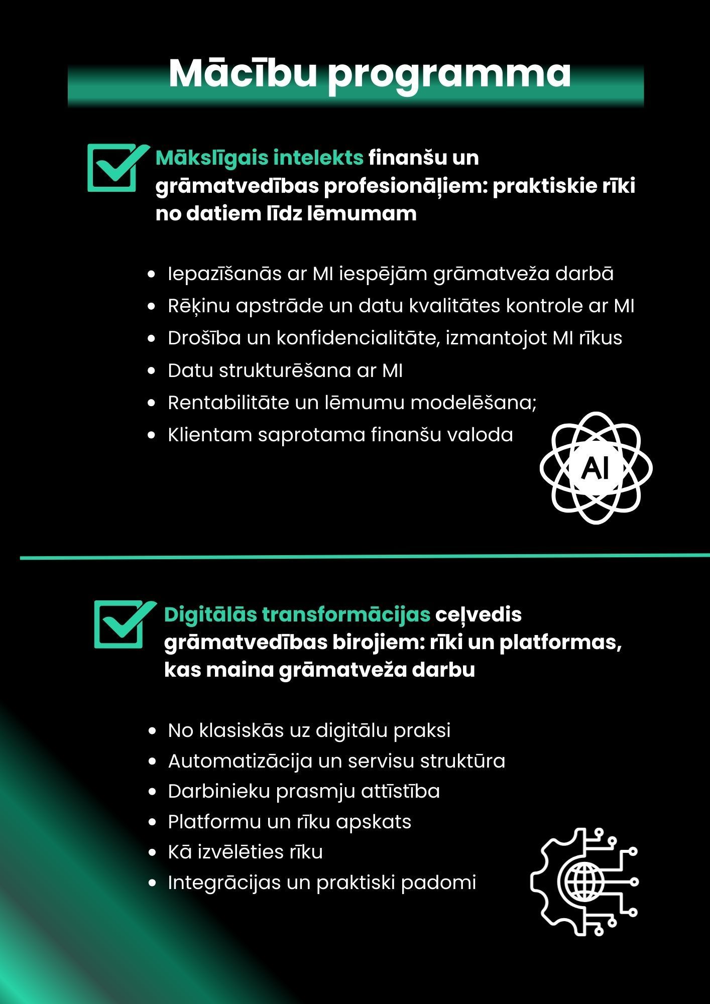 12. un 13. februāris - Mākslīgais intelekts finanšu un grāmatvedības profesionāļiem: praktiskie rīki no datiem līdz lēmumam (dalībniekiem vēlams līdzi savs dators un izveidots konts ChatGPT);