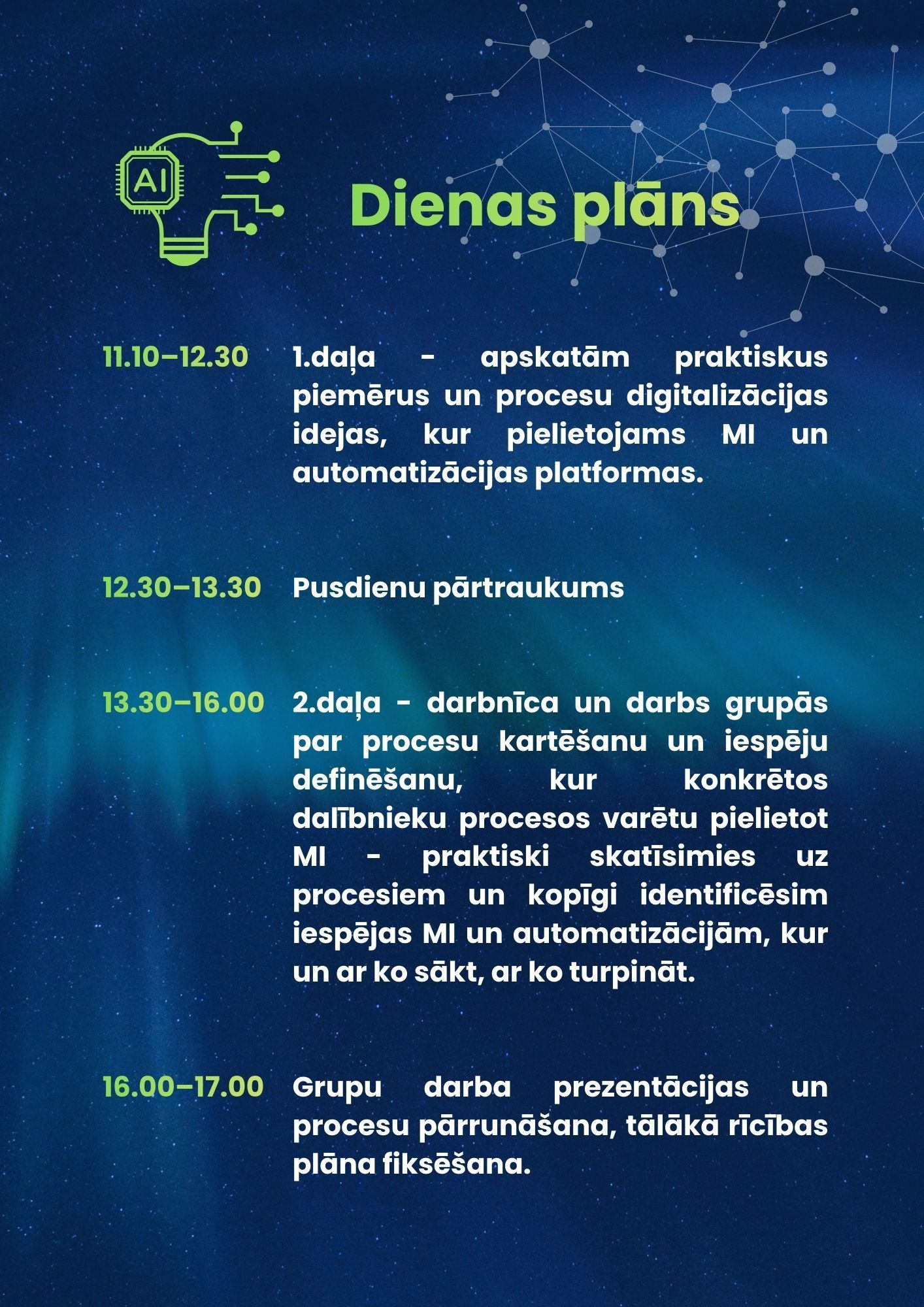 Pievienojies praktiskai darbnīcai, kurā kopīgi izpētīsim jaunākās MI pielietojuma iespējas biznesa procesos – no ikdienas uzdevumu automatizācijas līdz sarežģītāku procesu optimizācijai.