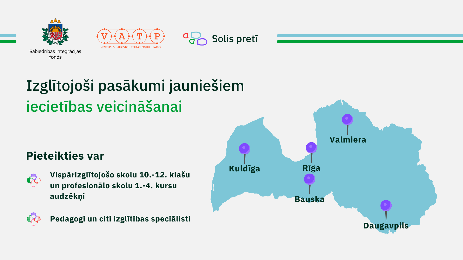 Sabiedrības integrācijas fonds (SIF) sadarbībā ar nodibinājumu “Ventspils Augsto tehnoloģiju parks” (VATP) īsteno bezmaksas izglītojošos pasākumus jauniešiem un pedagogiem ar mērķi mazināt neiecietību jauniešu vidū, veicinot savstarpēju sapratni un kritisko domāšanu, kā arī sniegt jauniešiem un pedagogiem nepieciešamos rīkus problēmsituāciju risināšanai. Pieteikšanās šeit.